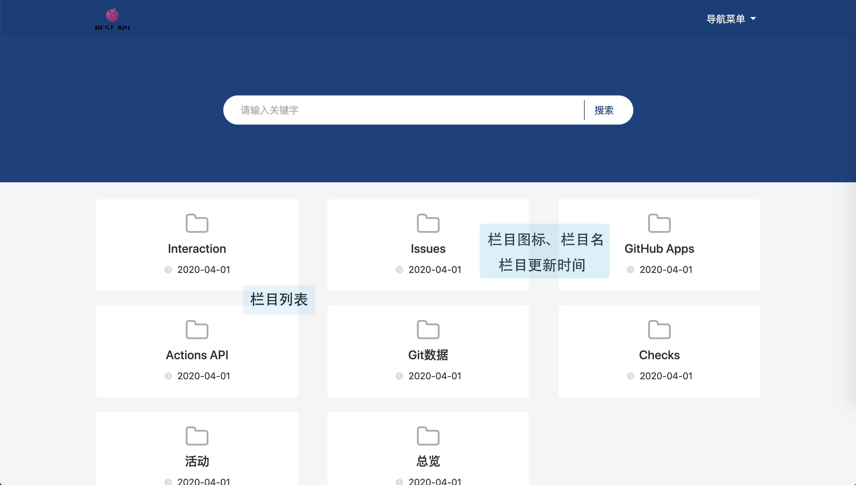 首页采用栏目Card排列方式突出主栏目平级关系,适用于主栏目清晰且重点明确,子栏目很多的文档